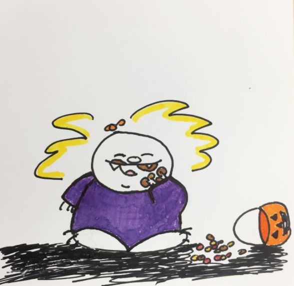 Troll Girl got a head start on her Halloween candy she found on the ground. She’s very excited to eat it all.